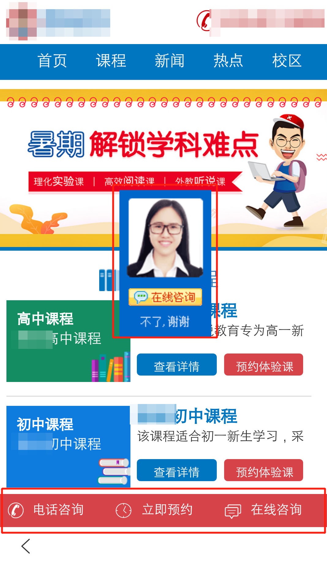 负面案例:咨询窗口自动弹出,在页面中央悬浮,影响用户体验