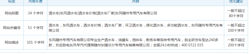 网站的TDK是应该网站的重中之重,网站的TDK能决定网站长期发展排名情况,刚接到站的时候,网站TDK设置非常不合理,标题只有“东风随州专用汽车有限公司”,关键词和描述都只是“洒水车”,这是非常不合理的,在跟客户进行沟通后,我们对网站的TDK进行了重新编辑填充。