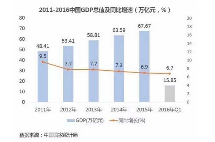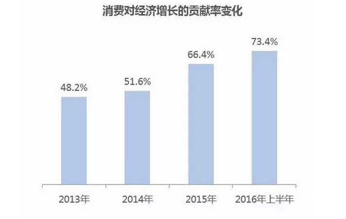 从 宏观大环境来看,2016 年国民经济延续 2015 年的中高速增长,GDP 增速难以逾越 7% 大关。与此同时,消费占经济增长的比率逐年提升,2016 年上半年达到 73.4%,成为经济增长的重要引擎。在经济进入中高速增长的新常态下,供给侧改革创新与居民消费升级的趋势显现。